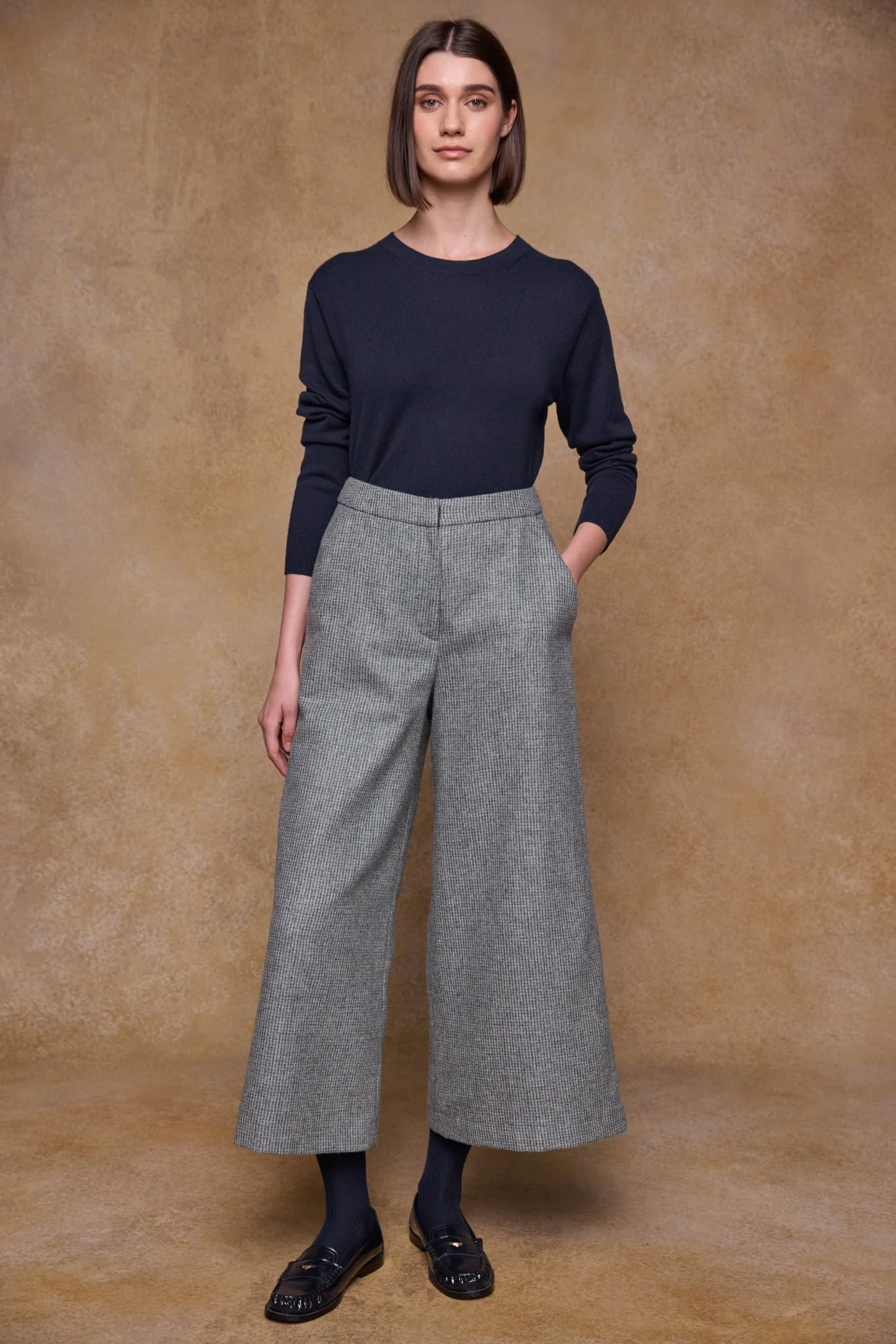 Discover the Classic Wool Tweed Culotte Style Trousers, a seamless blend of timeless sophistication and effortless practicality. Crafted from 100% Yorkshire-woven wool tweed, these tailored culottes feature a flattering high-waisted fit and a structured wide-leg silhouette that drapes beautifully, creating a look that is both polished and versatile. Perfect for elegant gatherings, or elevated everyday wear, they bring refined heritage style to the modern wardrobe.