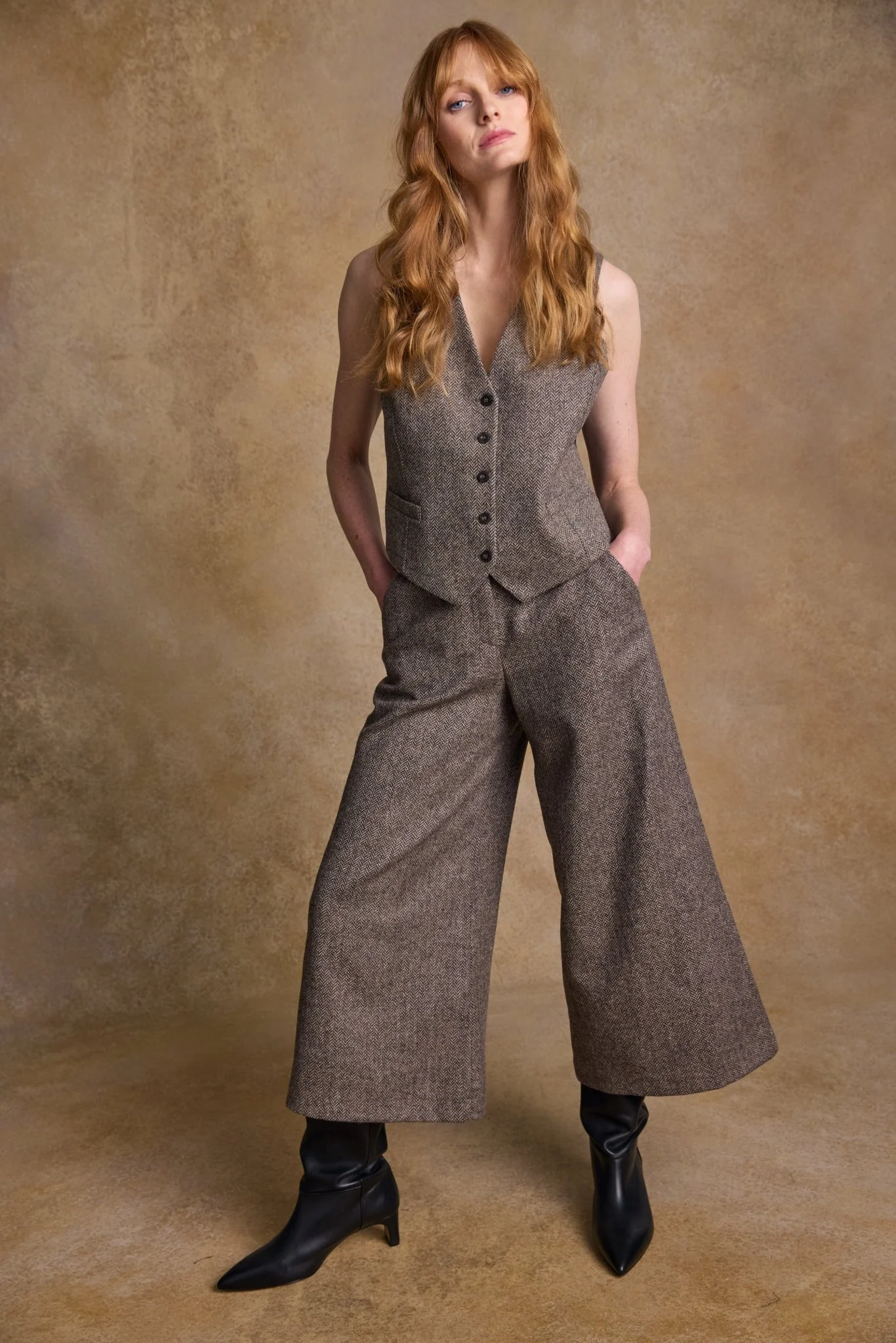 Discover the Classic Wool Tweed Culotte Style Trousers, a seamless blend of timeless sophistication and effortless practicality. Crafted from 100% Yorkshire-woven wool tweed, these tailored culottes feature a flattering high-waisted fit and a structured wide-leg silhouette that drapes beautifully, creating a look that is both polished and versatile. Perfect for elegant gatherings, or elevated everyday wear, they bring refined heritage style to the modern wardrobe.