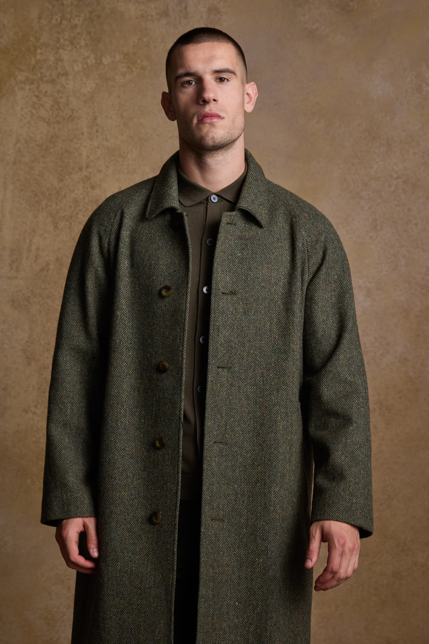The Classic Oversized Tailored Full-Length Coat combines traditional craftsmanship with modern versatility. Expertly made from 100% Donegal-woven tweed, it delivers a structured, masculine silhouette with an oversized cut and a clean longline profile. The raglan sleeves create a relaxed sloped shoulder, giving the coat a natural ease of movement while maintaining sharp, tailored lines. Designed with heritage in mind and finished with refined detailing, it carries a quiet nod to early 20th-century tailoring, reimagined for today.